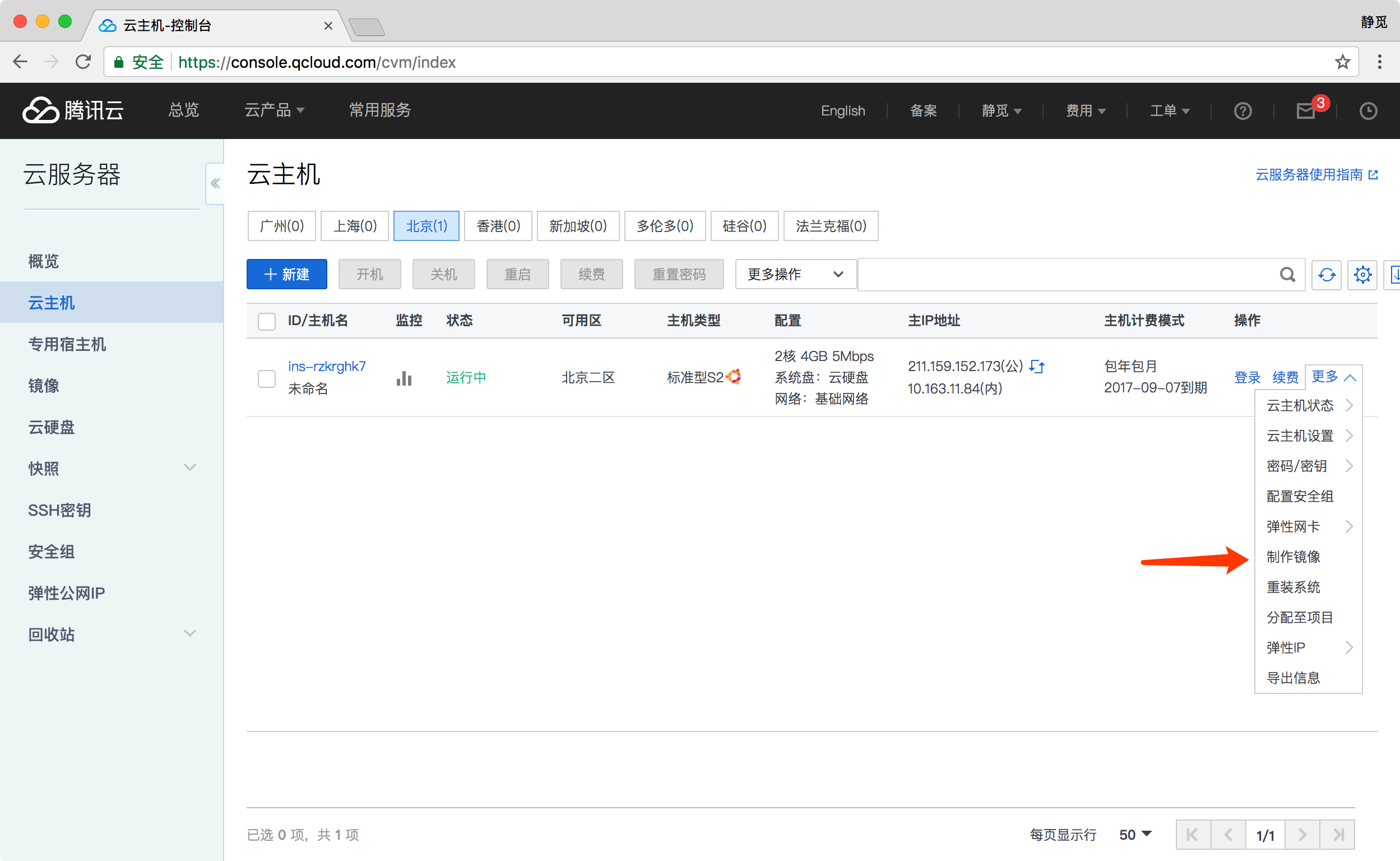 首先进入到腾讯云后台,可以点击更多选项制作镜像,如图 15-3 所示。